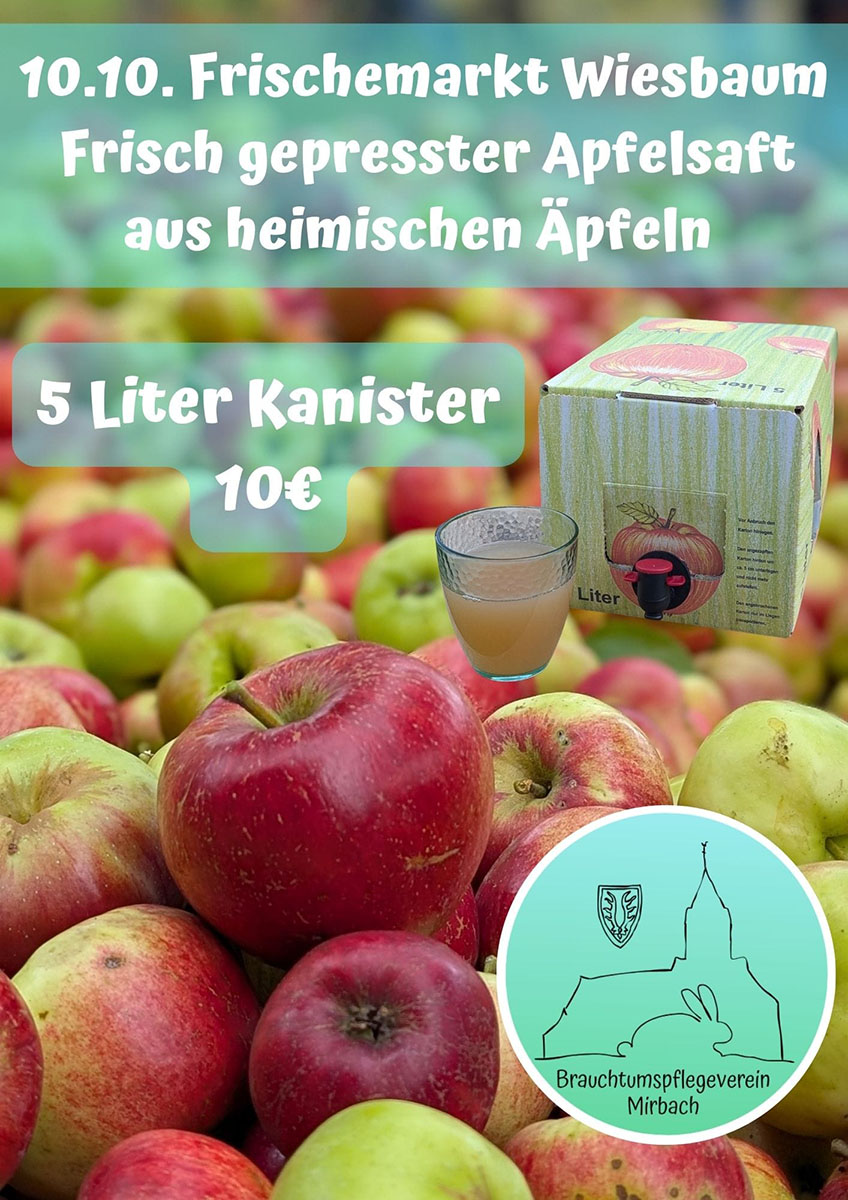 Frisch gepresster Apfelsaft 10.10. Frischemarkt Wiesbaum Frisch gepresster Apfelsaft aus heimischen Äpfeln 5 Liter Kanister – 10 €