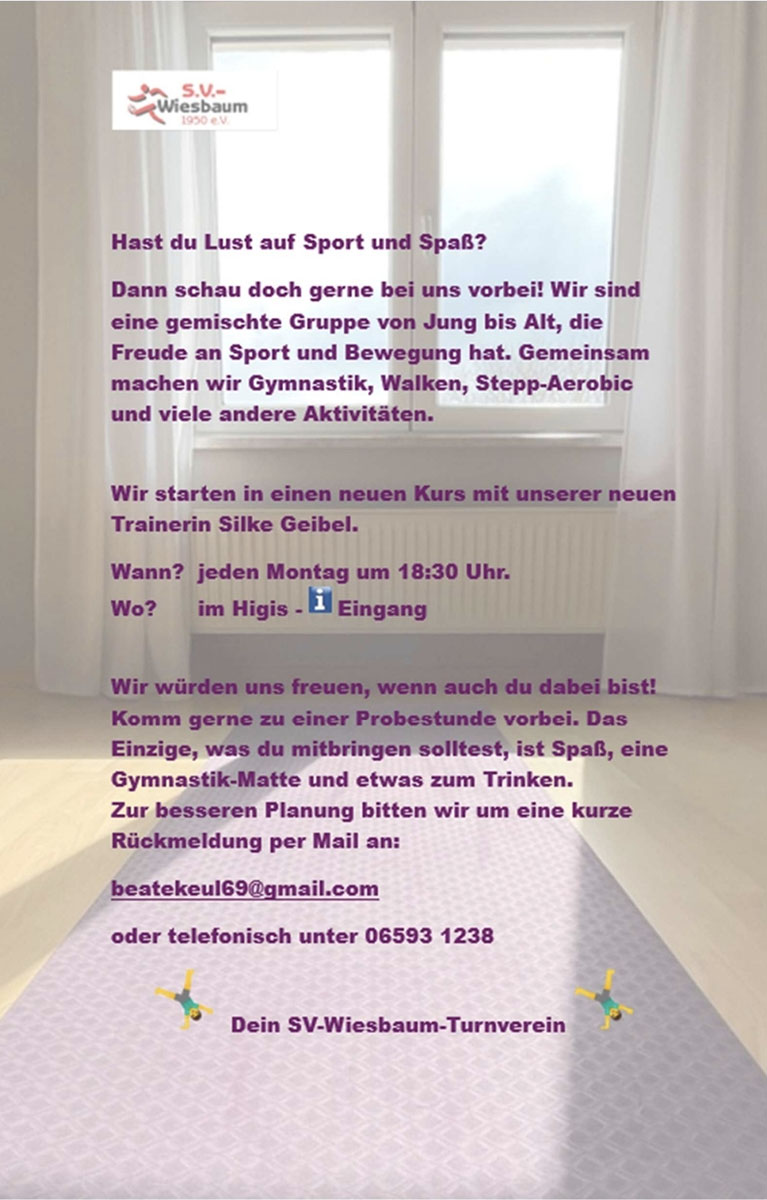 Dann schau doch gerne bei uns vorbei! Wir sind eine gemischte Gruppe von Jung bis Alt, die Freude an Sport und Bewegung hat. Gemeinsam machen wir Gymnastik, Walken, Stepp-Aerobic und viele andere Aktivitäten.
